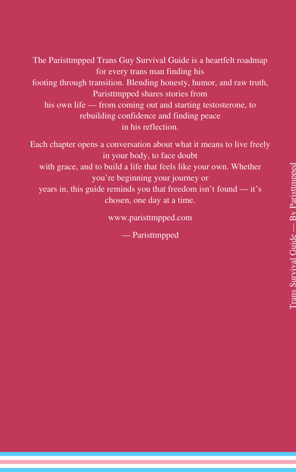 Blending memoir, reflection, and survival wisdom, Paristtmpped shares his raw story of transformation from fear to freedom, isolation to community, shame to full embodiment. Through chapters on identity, safety, dysphoria, confidence, and creative expression, this book offers grounded tools for growth while reminding readers that transition is more than change. It is self liberation.